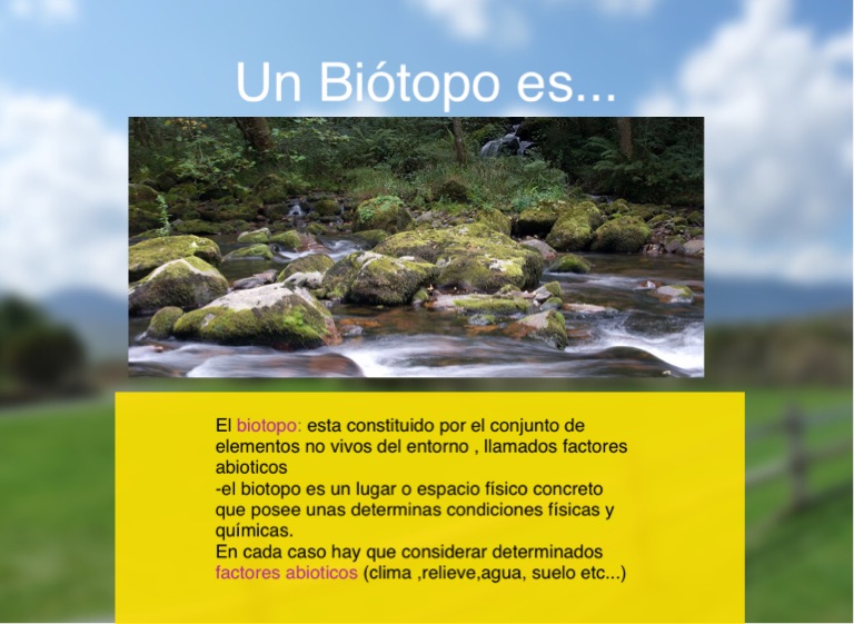 El biotopo: esta constituido por el conjunto de elementos no vivos del entorno , llamados factores abioticos