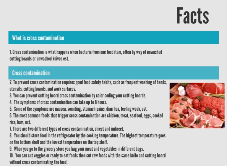 1. Cross contamination is what happens when bacteria from one food item, often by way of unwashed cutting boards or unwashed knives est.