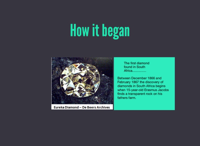 Between December 1866 and February 1867 the discovery of diamonds in South Africa begins when 15-year-old Erasmus Jacobs finds a transparent rock on his fathers farm.