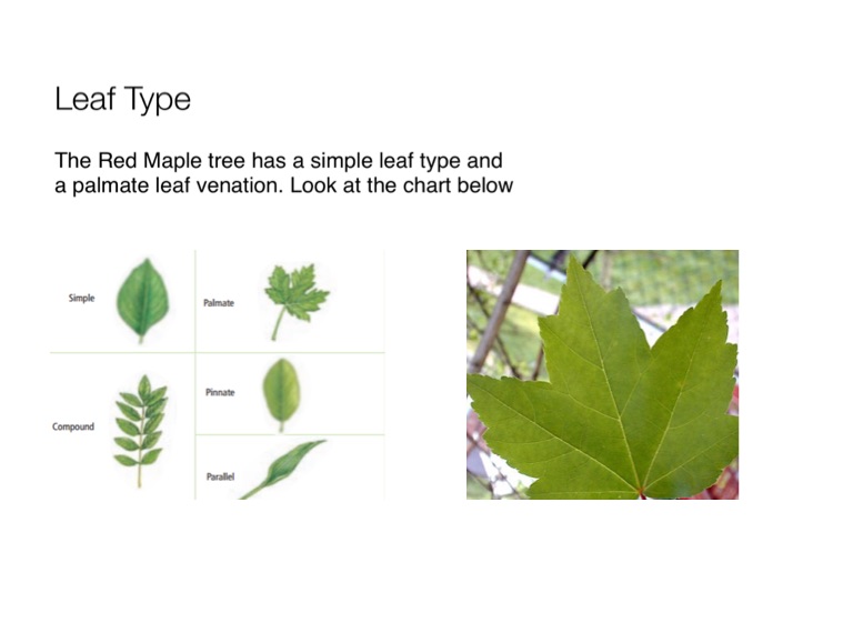 The Red Maple tree has a simple leaf type and a palmate leaf venation. Look at the chart below