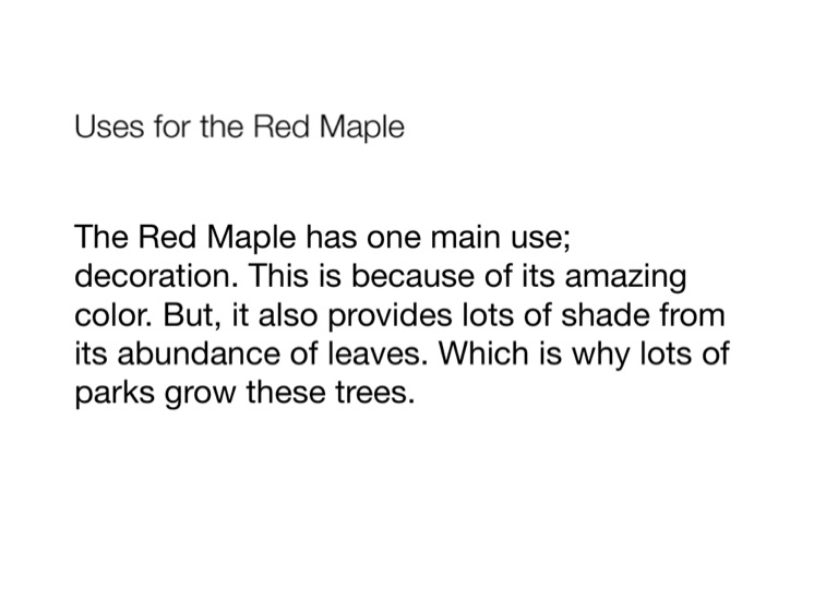The Red Maple has one main use; decoration. This is because of its amazing color. But, it also provides lots of shade from its abundance of leaves. Which is why lots of parks grow these trees.