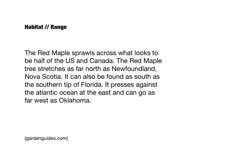 The Red Maple sprawls across what looks to be half of the US and Canada. The Red Maple tree stretches as far north as Newfoundland, Nova Scotia. It can also be found as south as the southern tip of Florida. It presses against the atlantic ocean at the east and can go as far west as Oklahoma.