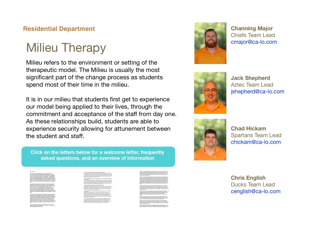 Milieu refers to the environment or setting of the therapeutic model. The Milieu is usually the most significant part of the change process as students spend most of their time in the milieu.