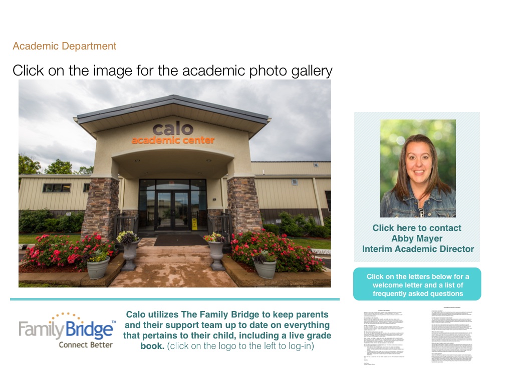 Calo utilizes The Family Bridge to keep parents and their support team up to date on everything that pertains to their child, including a live grade book. (click on the logo to the left to log-in)