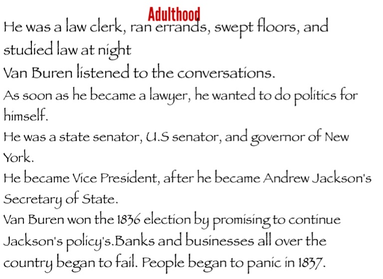 Van Buren won the 1836 election by promising to continue Jackson's policy's.Banks and businesses all over the country began to fail. People began to panic in 1837.