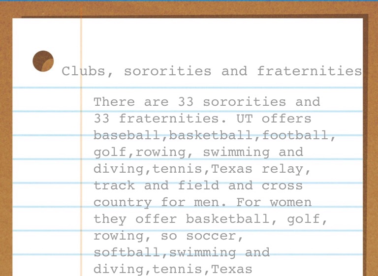 There are 33 sororities and 33 fraternities. UT offers baseball,basketball,football, golf,rowing, swimming and diving,tennis,Texas relay, track and field and cross country for men. For women they offer basketball, golf, rowing, so soccer, softball,swimming and diving,tennis,Texas relays,track and field, cross country and volleyball.