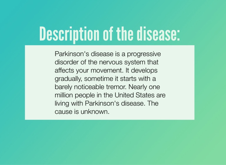 Parkinson's disease is a progressive disorder of the nervous system that affects your movement. It develops gradually, sometime it starts with a barely noticeable tremor. Nearly one million people in the United States are living with Parkinson's disease. The cause is unknown.