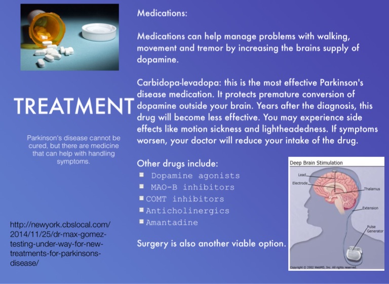 Carbidopa-levadopa: this is the most effective Parkinson's disease medication. It protects premature conversion of dopamine outside your brain. Years after the diagnosis, this drug will become less effective. You may experience side effects like motion sickness and lightheadedness. If symptoms worsen, your doctor will reduce your intake of the drug.