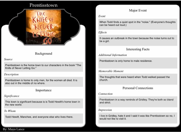 Prentisstown is where our story takes place. It is the hometown tour main character, and it is the only truly functioning town in the new world. There are no women here, for they all died from disease a strange race spread.