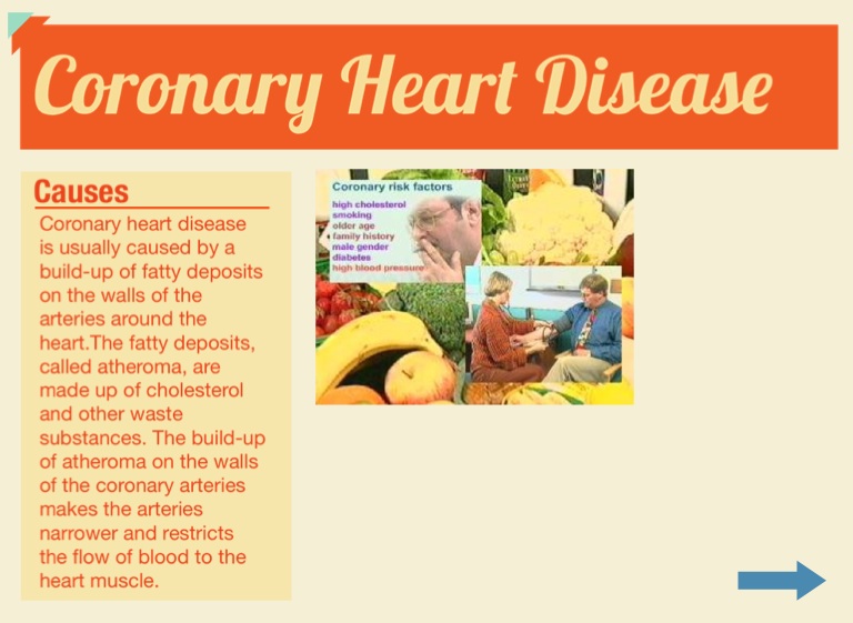 Coronary heart disease is usually caused by a build-up of fatty deposits on the walls of the arteries around the heart.The fatty deposits, called atheroma, are made up of cholesterol and other waste substances. The build-up of atheroma on the walls of the coronary arteries makes the arteries narrower and restricts the flow of blood to the heart muscle.