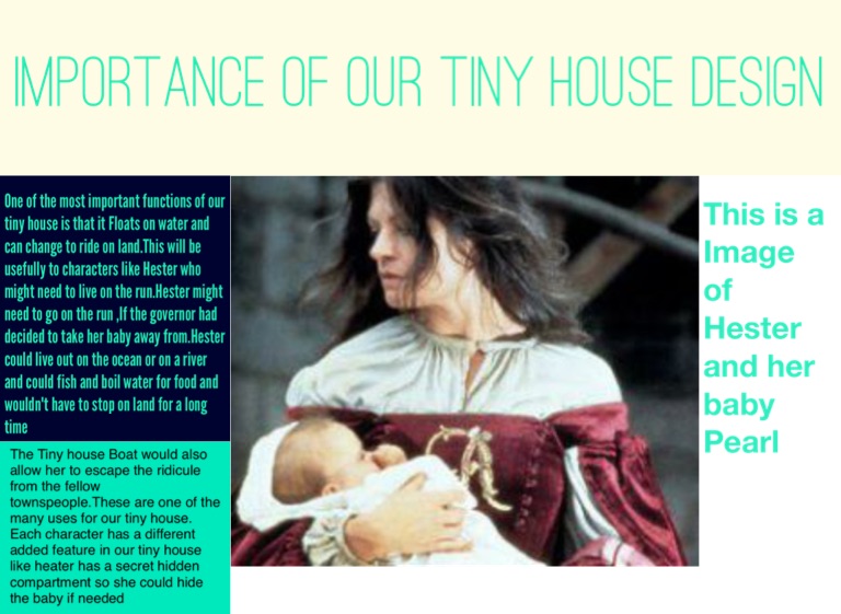 One of the most important functions of our tiny house is that it Floats on water and can change to ride on land.This will be usefully to characters like Hester who might need to live on the run.Hester might need to go on the run ,If the governor had decided to take her baby away from.Hester could live out on the ocean or on a river and could fish and boil water for food and wouldn't have to stop on land for a long time