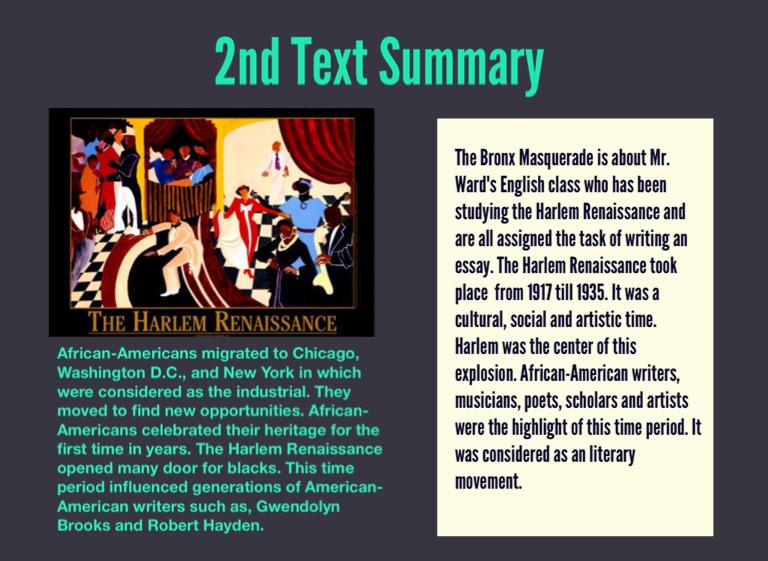 The Bronx Masquerade is about Mr. Ward's English class who has been studying the Harlem Renaissance and are all assigned the task of writing an essay. The Harlem Renaissance took place from 1917 till 1935. It was a cultural, social and artistic time. Harlem was the center of this explosion. African-American writers, musicians, poets, scholars and artists were the highlight of this time period. It was considered as an literary movement.