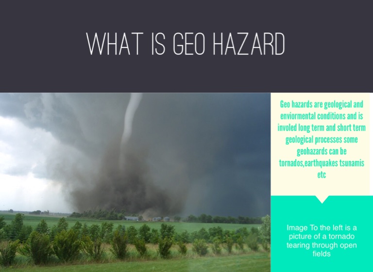 Geo hazards are geological and enviormental conditions and is involed long term and short term geological processes some geohazards can be tornados,earthquakes tsunamis etc