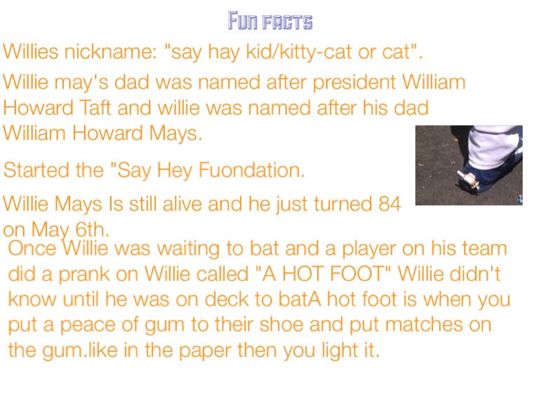 Once Willie was waiting to bat and a player on his team did a prank on Willie called "A HOT FOOT" Willie didn't know until he was on deck to batA hot foot is when you put a peace of gum to their shoe and put matches on the gum.like in the paper then you light it.