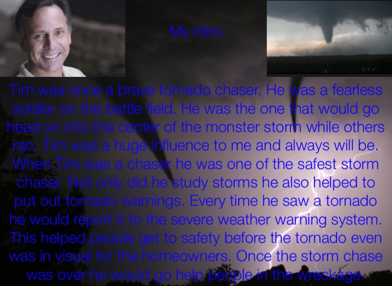 Tim was once a brave tornado chaser. He was a fearless soldier on the battle field. He was the one that would go head on into the center of the monster storm while others ran. Tim was a huge influence to me and always will be. When Tim was a chaser he was one of the safest storm chaser. Not only did he study storms he also helped to put out tornado warnings. Every time he saw a tornado he would report it to the severe weather warning system. This helped people get to safety before the tornado even was in visual for the homeowners. Once the storm chase was over he would go help people in the wreckage.