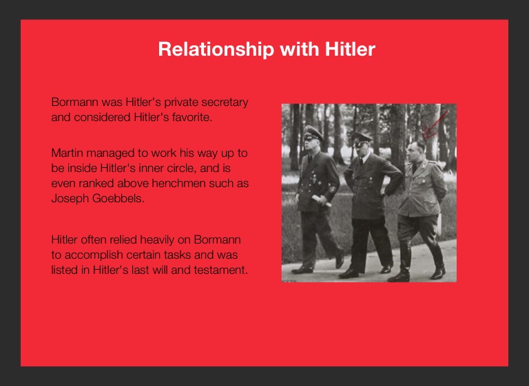 Hitler often relied heavily on Bormann to accomplish certain tasks and was listed in Hitler's last will and testament.