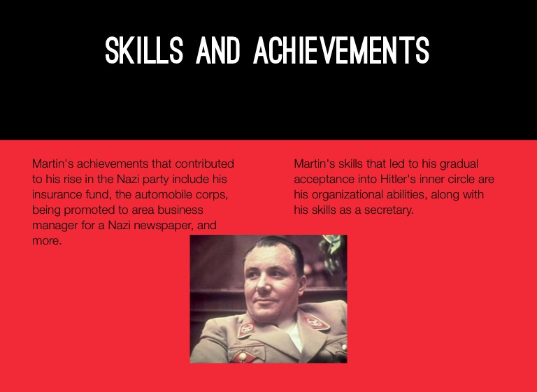 Martin's achievements that contributed to his rise in the Nazi party include his insurance fund, the automobile corps, being promoted to area business manager for a Nazi newspaper, and more.