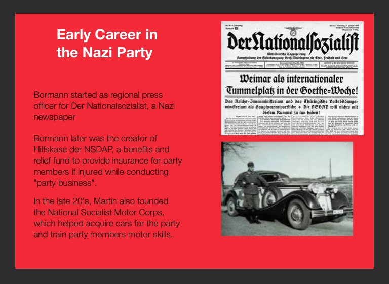 Bormann later was the creator of Hilfskase der NSDAP, a benefits and relief fund to provide insurance for party members if injured while conducting "party business".