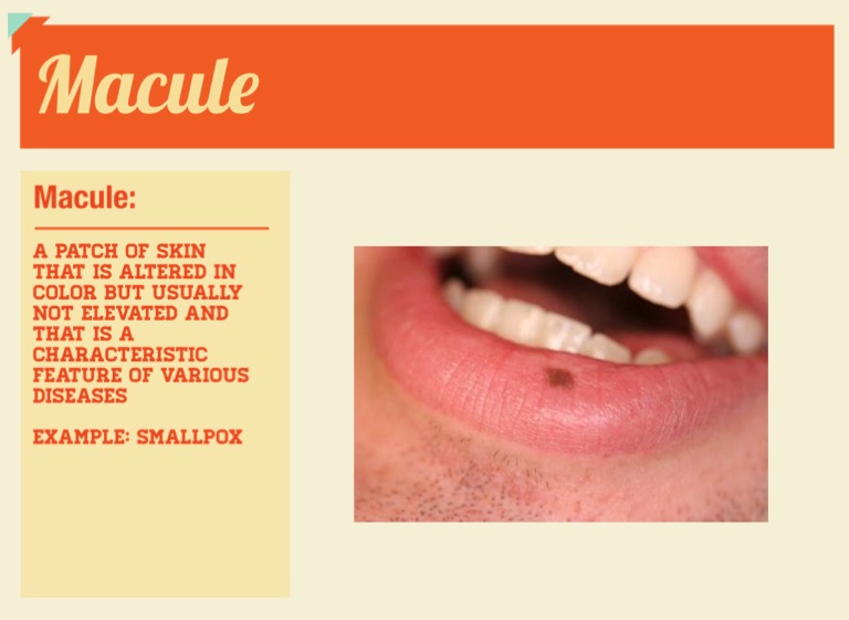 a patch of skin that is altered in color but usually not elevated and that is a characteristic feature of various diseases