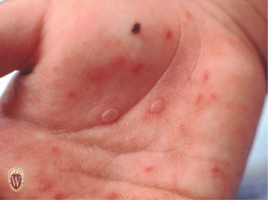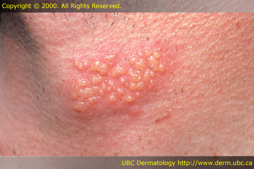 a small abnormal elevation of the outer layer of skin enclosing a watery liquid