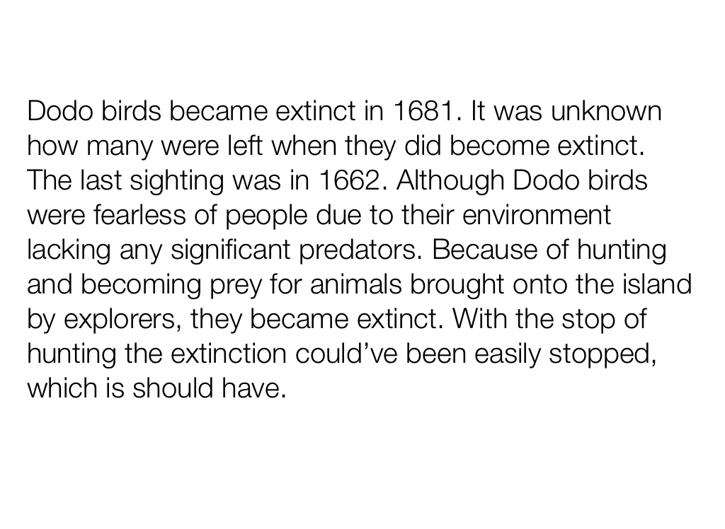 Dodo birds became extinct in 1681. It was unknown how many were left when they did become extinct. The last sighting was in 1662. Although Dodo birds were fearless of people due to their environment lacking any significant predators. Because of hunting and becoming prey for animals brought onto the island by explorers, they became extinct. With the stop of hunting the extinction could’ve been easily stopped, which is should have.