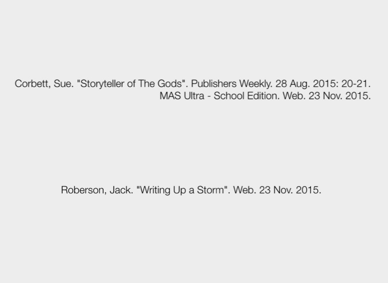 Corbett, Sue. "Storyteller of The Gods". Publishers Weekly. 28 Aug. 2015: 20-21.