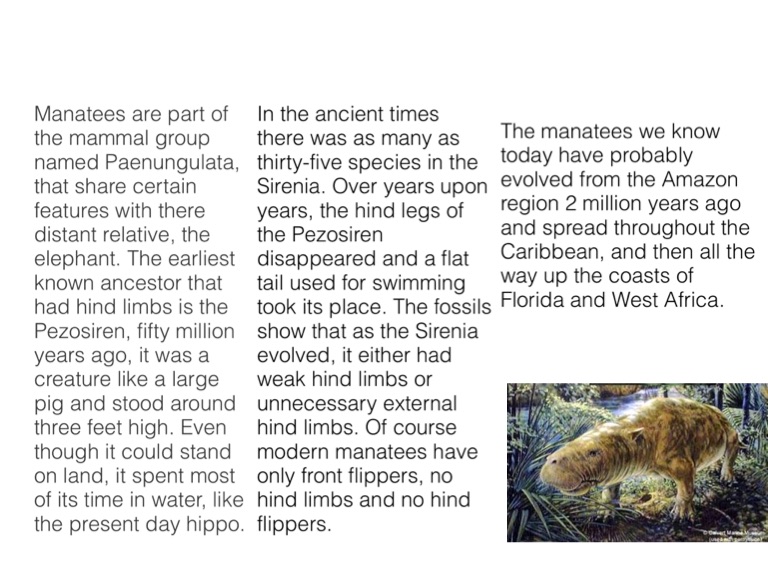 Manatees are part of the mammal group named Paenungulata, that share certain features with there distant relative, the elephant. The earliest known ancestor that had hind limbs is the Pezosiren, fifty million years ago, it was a creature like a large pig and stood around three feet high. Even though it could stand on land, it spent most of its time in water, like the present day hippo.