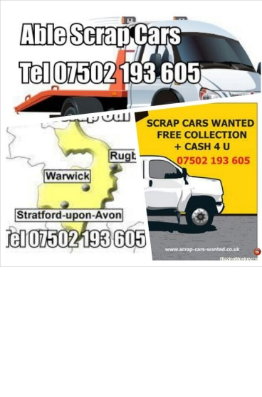 Able Scrap Cars Warwickshire Tel 07502 193 605 TOTALLY FREE scrap car collection and LEGAL DISPOSAL throughout Coventry and Warwickshire D.V.L.A INFORMED and receipts given We work in conjunction with a local Authorised Waste Treatment Facility so your vehicle us scrapped to Environment Agency Guidelines NO HIDDEN CHARGES GUARANTEED! Courteous and professional service 7 days a week Scrap/Old/Broke Down Car Disposal in Coventry Scrap/Old/Broke Down Car Disposal in Stratford upon Avon Scrap/Old/Broke Down Car Disposal in Leamington Spa Scrap/Old/Broke Down Car Disposal in Kenilworth Scrap/Old/Broke Down Car Disposal in Nuneaton Scrap/Old/Broke Down Car Disposal in Rugby Scrap/Old/Broke Down Car Disposal in Bedworth Scrap/Old/Broke Down Car Disposal in Henley in Arden