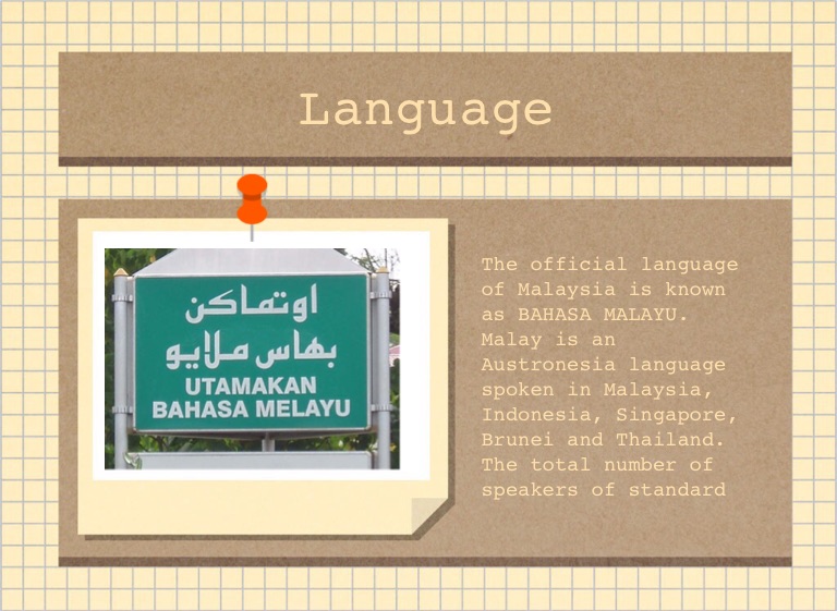The official language of Malaysia is known as BAHASA MALAYU. Malay is an Austronesia language spoken in Malaysia, Indonesia, Singapore, Brunei and Thailand. The total number of speakers of standard Malay is about 18 million.