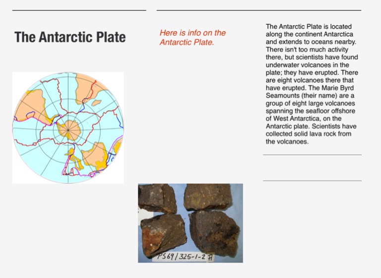 The Antarctic Plate is located along the continent Antarctica and extends to oceans nearby. There isn't too much activity there, but scientists have found underwater volcanoes in the plate; they have erupted. There are eight volcanoes there that have erupted. The Marie Byrd Seamounts (their name) are a group of eight large volcanoes spanning the seafloor offshore of West Antarctica, on the Antarctic plate. Scientists have collected solid lava rock from the volcanoes.