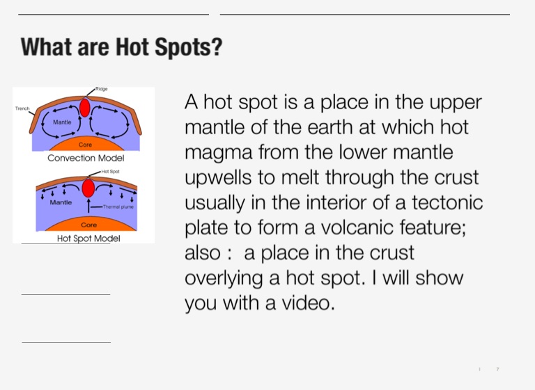 A hot spot is a place in the upper mantle of the earth at which hot magma from the lower mantle upwells to melt through the crust usually in the interior of a tectonic plate to form a volcanic feature; also : a place in the crust overlying a hot spot. I will show you with a video.