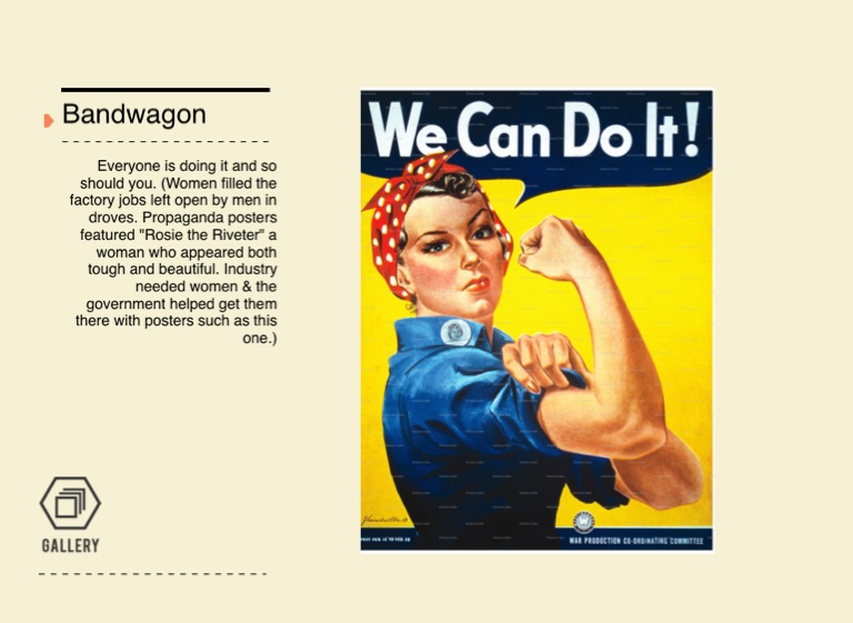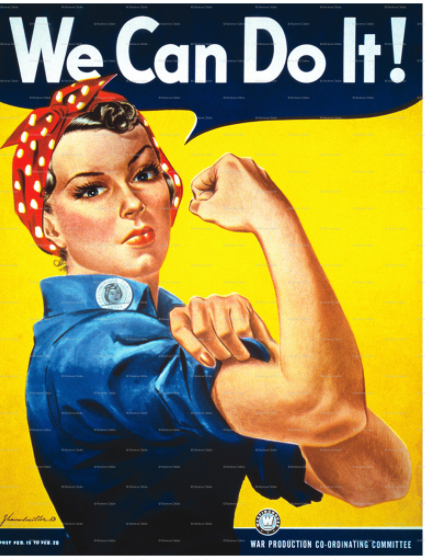 Everyone is doing it and so should you. (Women filled the factory jobs left open by men in droves. Propaganda posters featured "Rosie the Riveter" a woman who appeared both tough and beautiful. Industry needed women & the government helped get them there with posters such as this one.)
