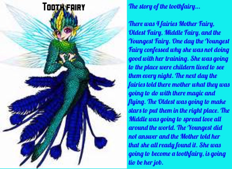 There was 4 fairies Mother Fairy, Oldest Fairy, Middle Fairy, and the Youngest Fairy. One day the Youngest Fairy confessed why she was not doing good with her training. She was going to the place were childern lived to see them every night. The next day the fairies told there mother what they was going to do with there magic and flying. The Oldest was going to make stars to put them in the right place. The Middle was going to spread love all around the world. The Youngest did not answer and the Mother told her that she all ready found it. She was going to become a toothfairy, is going tio be her job.
