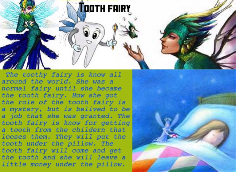 The toothy fairy is know all around the world. She was a normal fairy until she became the tooth fairy. How she got the role of the tooth fairy is a mystery, but is belived to be a job that she was granted. The tooth fairy is know for getting a tooth from the childern that looses them. They will put the tooth under the pillow. The tooth fairy will come and get the tooth and she will leave a little money under the pillow.