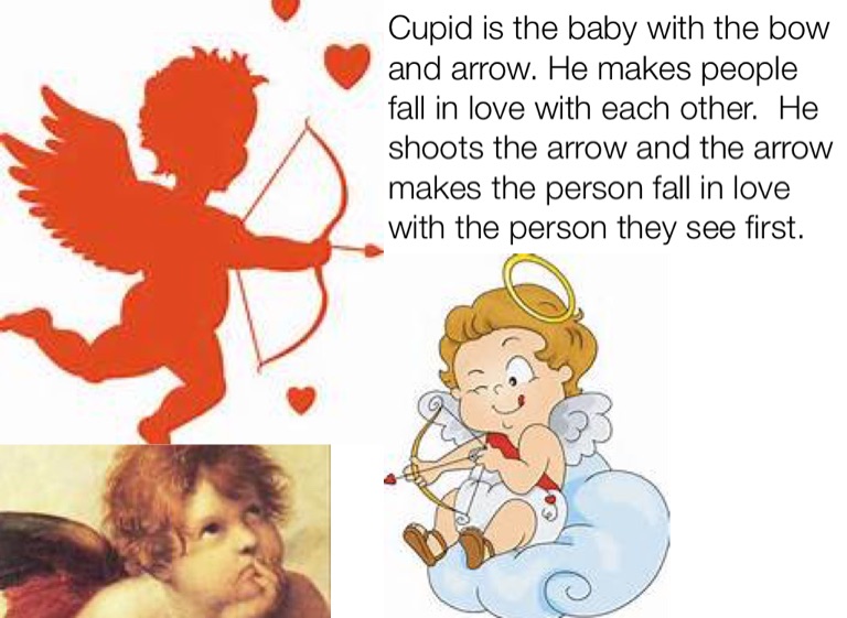 Cupid is the baby with the bow and arrow. He makes people fall in love with each other. He shoots the arrow and the arrow makes the person fall in love with the person they see first.