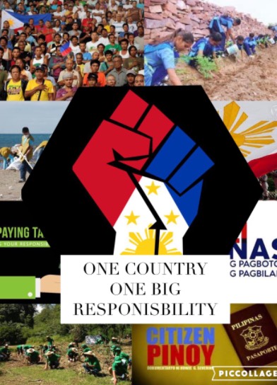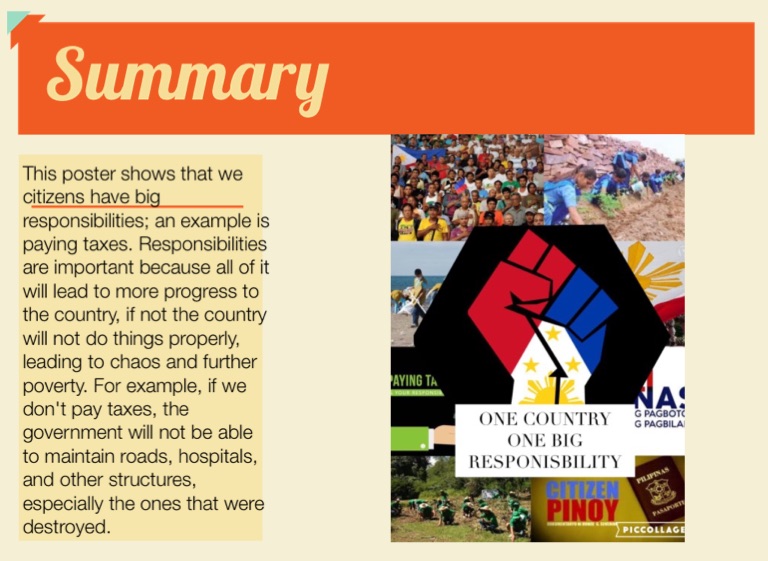 This poster shows that we citizens have big responsibilities; an example is paying taxes. Responsibilities are important because all of it will lead to more progress to the country, if not the country will not do things properly, leading to chaos and further poverty. For example, if we don't pay taxes, the government will not be able to maintain roads, hospitals, and other structures, especially the ones that were destroyed.