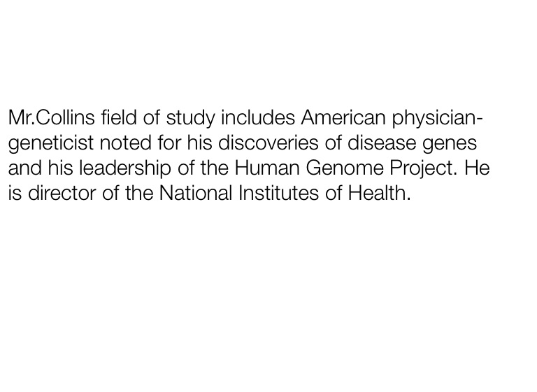Mr.Collins field of study includes American physician-geneticist noted for his discoveries of disease genes and his leadership of the Human Genome Project. He is director of the National Institutes of Health.