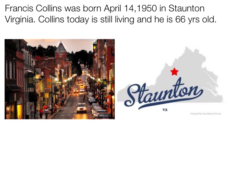 Francis Collins was born April 14,1950 in Staunton Virginia. Collins today is still living and he is 66 yrs old.