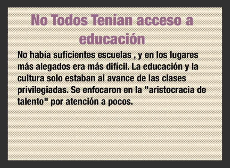No había suficientes escuelas , y en los lugares más alegados era más difícil. La educación y la cultura solo estaban al avance de las clases privilegiadas. Se enfocaron en la "aristocracia de talento" por atención a pocos.