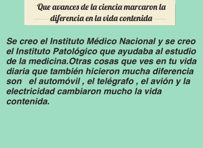 Se creo el Instituto Médico Nacional y se creo el Instituto Patológico que ayudaba al estudio de la medicina.Otras cosas que ves en tu vida diaria que también hicieron mucha diferencia son el automóvil , el telégrafo , el avión y la electricidad cambiaron mucho la vida contenida.