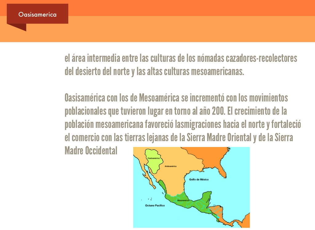 Oasisamérica con los de Mesoamérica se incrementó con los movimientos poblacionales que tuvieron lugar en torno al año 200. El crecimiento de la población mesoamericana favoreció lasmigraciones hacia el norte y fortaleció el comercio con las tierras lejanas de la Sierra Madre Oriental y de la Sierra Madre Occidental