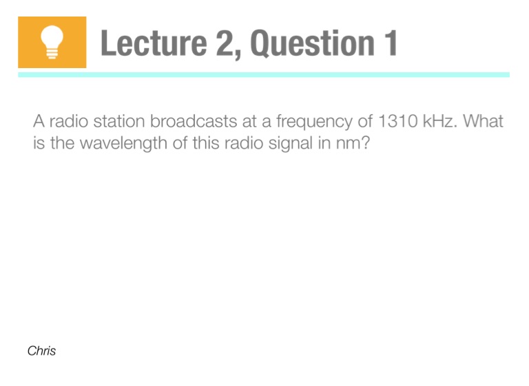 A radio station broadcasts at a frequency of 1310 kHz. What is the wavelength of this radio signal in nm?