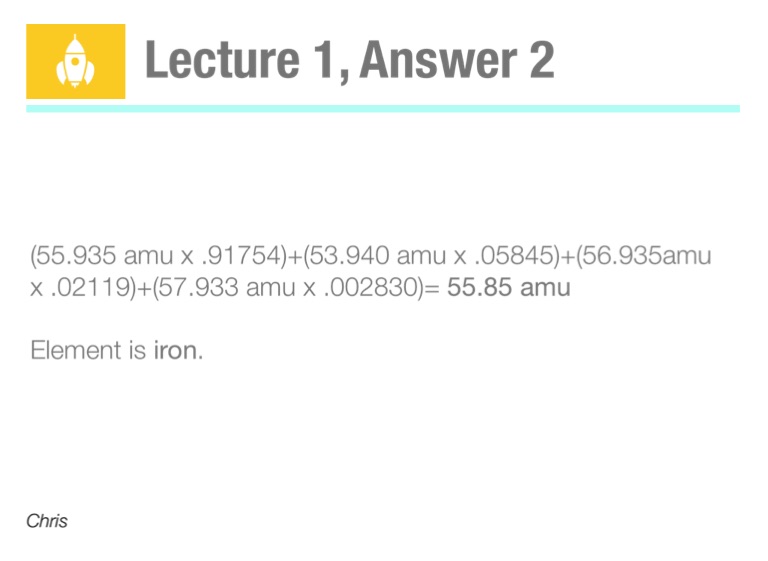 (55.935 amu x .91754)+(53.940 amu x .05845)+(56.935amu x .02119)+(57.933 amu x .002830)= 55.85 amu