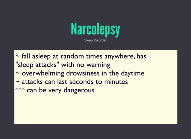 ~ fall asleep at random times anywhere, has "sleep attacks" with no warning
