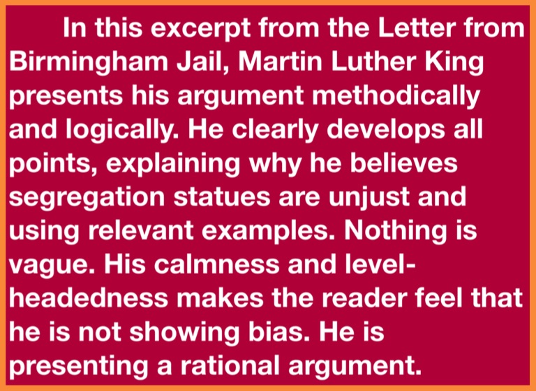 In this excerpt from the Letter from Birmingham Jail, Martin Luther King presents his argument methodically and logically. He clearly develops all points, explaining why he believes segregation statues are unjust and using relevant examples. Nothing is vague. His calmness and level-headedness makes the reader feel that he is not showing bias. He is presenting a rational argument.