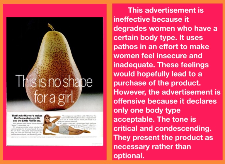 This advertisement is ineffective because it degrades women who have a certain body type. It uses pathos in an effort to make women feel insecure and inadequate. These feelings would hopefully lead to a purchase of the product. However, the advertisement is offensive because it declares only one body type acceptable. The tone is critical and condescending. They present the product as necessary rather than optional.