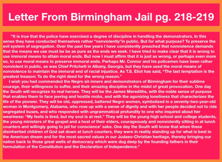 "It is true that the police have exercised a degree of discipline in handling the demonstrators. In this sense they have conducted themselves rather “nonviolently”in public. But for what purpose? To preserve the evil system of segregation. Over the past few years I have consistently preached that nonviolence demands that the means we use must be be as pure as the ends we seek. I have tried to make clear that it is wrong to use immoral means to attain moral ends. But now I must affirm that it is just as wrong, or perhaps even more so, to use moral means to preserve immoral ends. Perhaps Mr. Connor and his policemen have been rather nonviolent in public, as was Chief Pritchett in Albany, Georgia, but they have used the moral means of nonviolence to maintain the immoral end of racial injustice. As T.S. Eliot has said, “The last temptation is the greatest treason: To do the right deed for the wrong reason.”