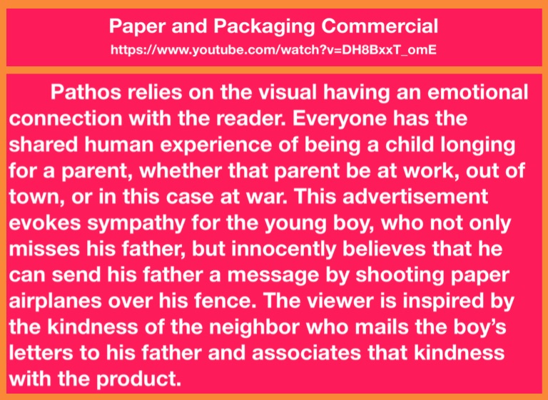 Pathos relies on the visual having an emotional connection with the reader. Everyone has the shared human experience of being a child longing for a parent, whether that parent be at work, out of town, or in this case at war. This advertisement evokes sympathy for the young boy, who not only misses his father, but innocently believes that he can send his father a message by shooting paper airplanes over his fence. The viewer is inspired by the kindness of the neighbor who mails the boy’s letters to his father and associates that kindness with the product.