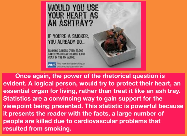 Once again, the power of the rhetorical question is evident. A logical person, would try to protect their heart, an essential organ for living, rather than treat it like an ash tray. Statistics are a convincing way to gain support for the viewpoint being presented. This statistic is powerful because it presents the reader with the facts, a large number of people are killed due to cardiovascular problems that resulted from smoking.