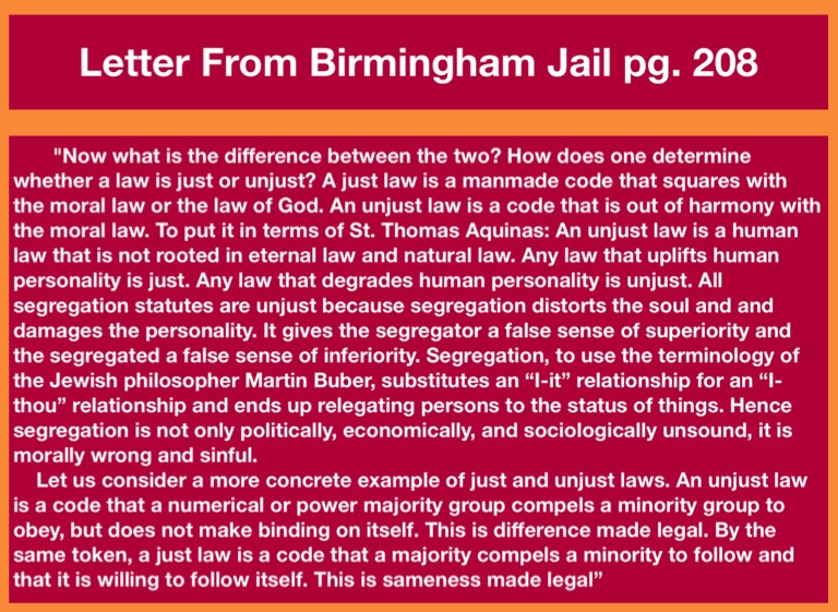 "Now what is the difference between the two? How does one determine whether a law is just or unjust? A just law is a manmade code that squares with the moral law or the law of God. An unjust law is a code that is out of harmony with the moral law. To put it in terms of St. Thomas Aquinas: An unjust law is a human law that is not rooted in eternal law and natural law. Any law that uplifts human personality is just. Any law that degrades human personality is unjust. All segregation statutes are unjust because segregation distorts the soul and and damages the personality. It gives the segregator a false sense of superiority and the segregated a false sense of inferiority. Segregation, to use the terminology of the Jewish philosopher Martin Buber, substitutes an “I-it” relationship for an “I-thou” relationship and ends up relegating persons to the status of things. Hence segregation is not only politically, economically, and sociologically unsound, it is morally wrong and sinful.